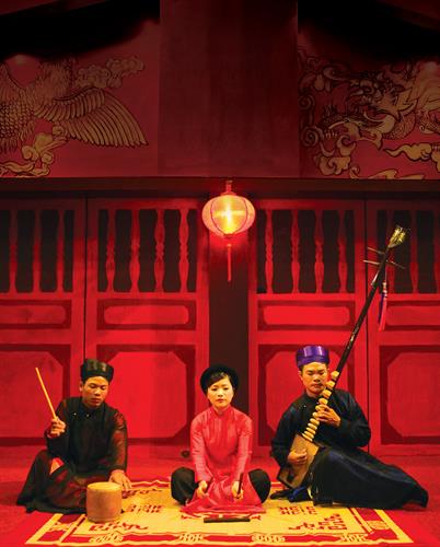C’est devenu un rendez-vous quotidien. Tous les soirs, à 19h, la terrasse de la maison du 87 rue Ma Mây, dans le vieux Hanoï, se transforme en scène de ca trù. Touristes et mélomanes suivent avec intérêt des interprètes de ce chant pluri-centenaire présenter leur art avec la plus grande sobriété qui soit. Juste une chanteuse qui tient le rythme en frappant sur un morceau de bambou posé à même la terre, un joueur de luth à trois cordes et un joueur de tambour. La chanteuse interprète des poèmes de grands lettrés avec une technique vocale dont l’originalité n’a d’égale que celle du luth à trois cordes (dan day), un instrument typique de la musique traditionnelle vietnamienne. Quant au joueur de tambour, c’était à l’origine un spectateur connaisseur qui frappait sur son tambour pour exprimer sa satisfaction devant une phrase ou une mélodie qui lui plaisait, d’où l’appellation consacrée «tambour d’éloge». Aujourd’hui, le joueur de tambour est souvent un instrumentiste professionnel.