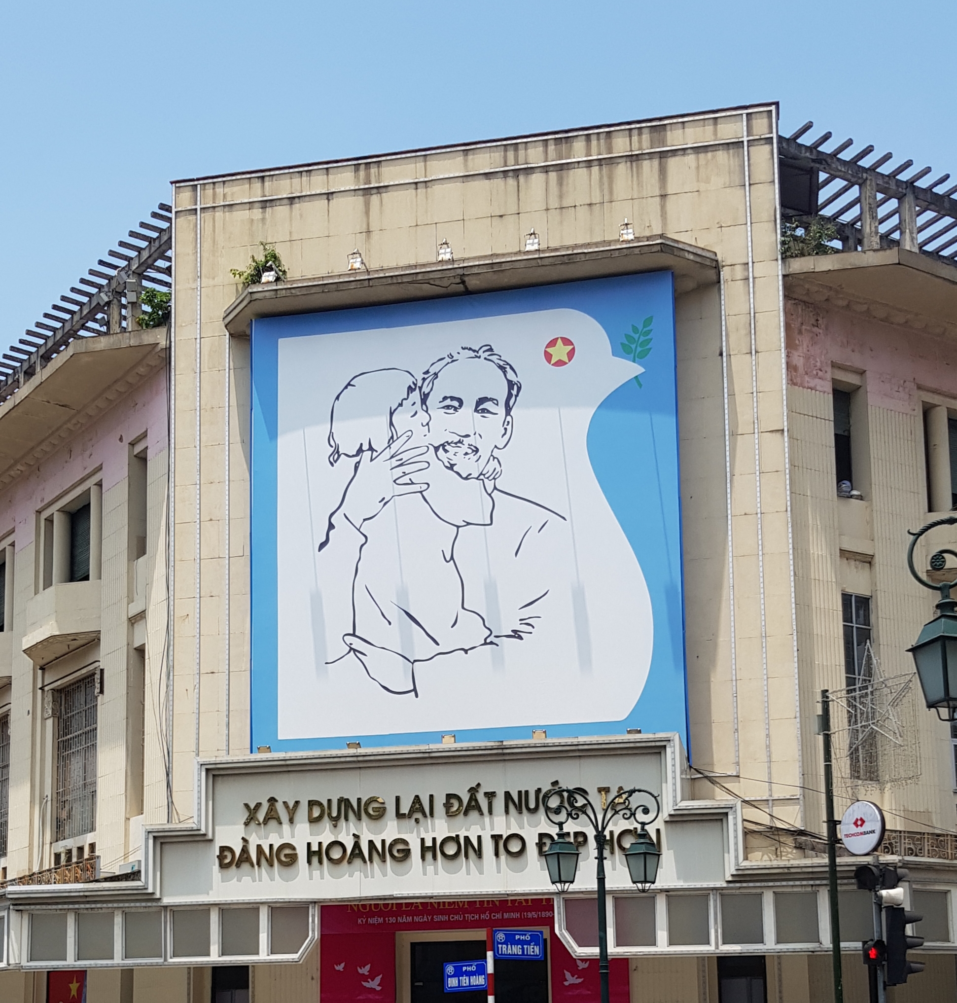 «Ce dessin présente le profil d’une colombe tenant dans son bec une branche d’olivier symbolisant la paix. Son ventre est en S comme la forme du Vietnam. L’emplacement de son œil correspond à la position de Hanoï si on la situe sur une carte. On voit le président Hô Chi Minh qui porte dans ses bras un bébé, ce qui symbolise l’éternité du pays. Le tableau s’est successivement appelé «Hô Chi Minh et l’enfant», «L’indépendance et la paix», et «L’indépendance, la réunification, la paix et le bonheur », nous raconte-t-il.