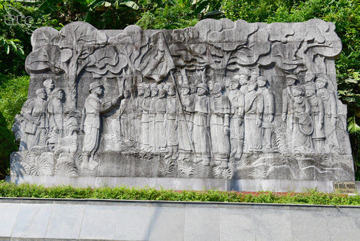 «Ce relief a été réalisé en 2004 à l’occasion du 60e anniversaire de la création de l’Armée populaire du Vietnam. Dans son centre, on reconnaît le général Vo Nguyên Giap et les 34 soldats qui étaient présents le jour de la création de la brigade. À gauche ce sont les représentants du comité interprovincial du Parti pour Cao Bang, Bac Kan et Lang Son et à droite ce sont les représentants des populations locales».