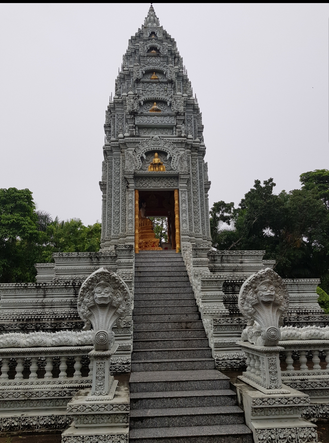 En effet, dès leur entrée dans la pagode, les touristes sont impressionnés. La porte arbore des motifs typiques de la culture khmère, notamment le serpent magique Naga et l'oiseau magique Krud, le tout rehaussé d'une finition dorée. Une allée de 100 mètres, bordée d'arbres séculaires, guide les visiteurs jusqu'au sanctuaire central.