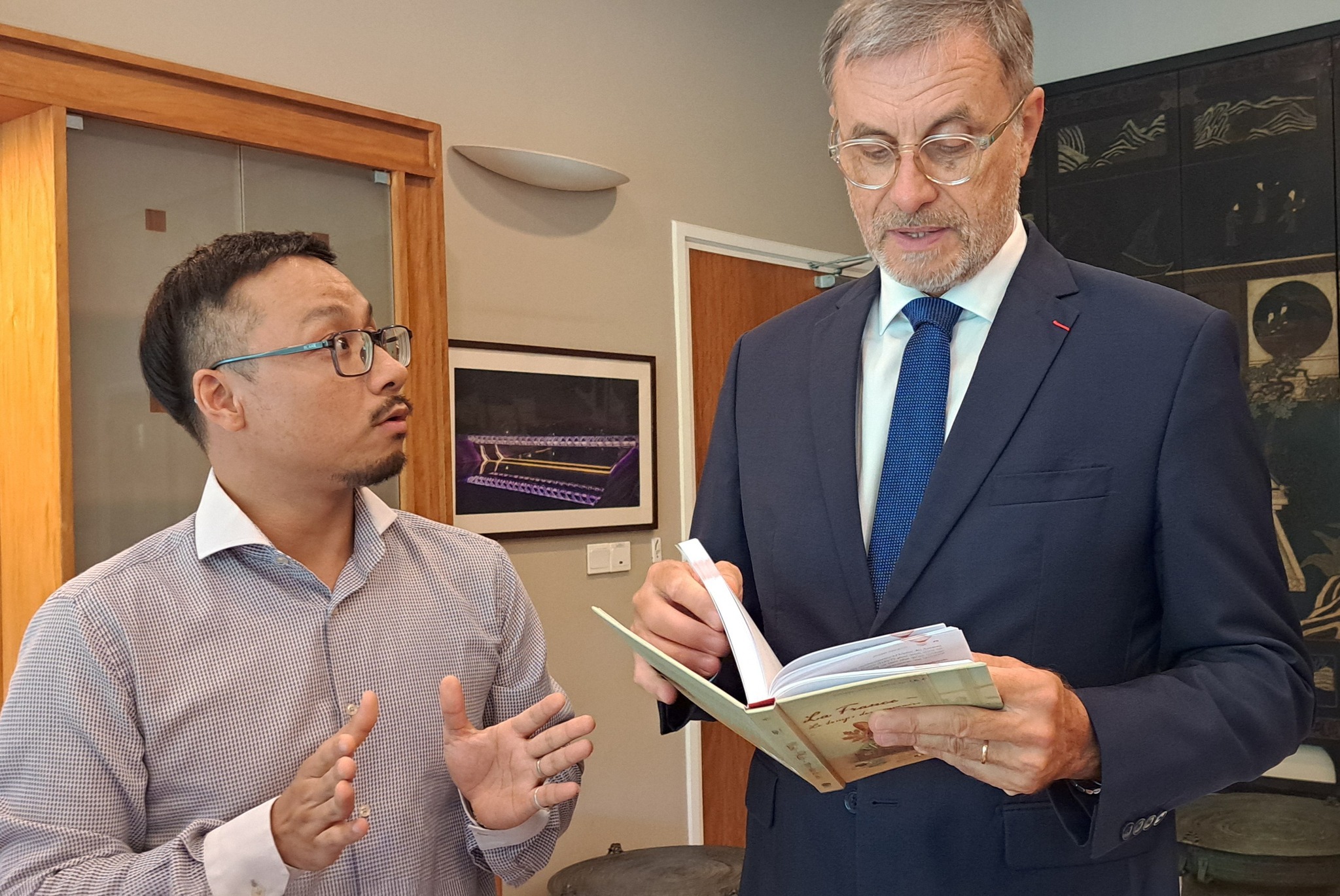 Dang Quôc Long (à gauche) échange avec l’ambassadeur de France au Vietnam, Olivier Brochet, autour de l’ouvrage. Photo: @uavf.org