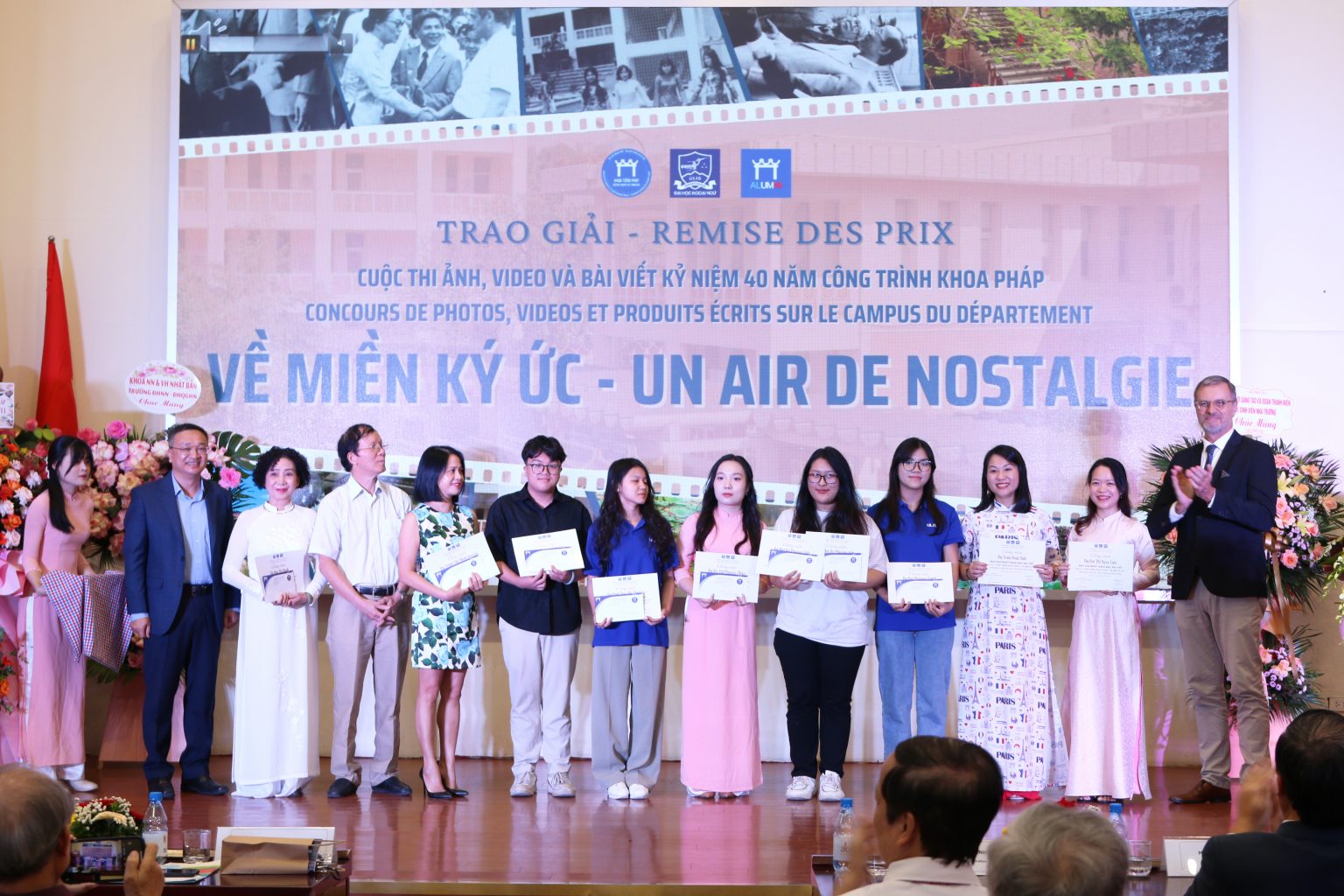 Ensuite, les participants du projet webtoon "Notre Nuit Étoilée", une œuvre captivante sur l'amour et la passion pour le français réalisée en collaboration entre le Département de français et l'Ambassade de France, avec le soutien de POPS COMICS, ont reçu des certificats de salutation. Des cadeaux de remerciement ont également été offerts aux anciens enseignants du Département. La journée s'est poursuivie avec la présentation du Comité exécutif de l'Association des anciens étudiants, une exposition de photos d'archives sur les locaux, et s'est terminée par un mini-concert dédié à la musique française en soirée.