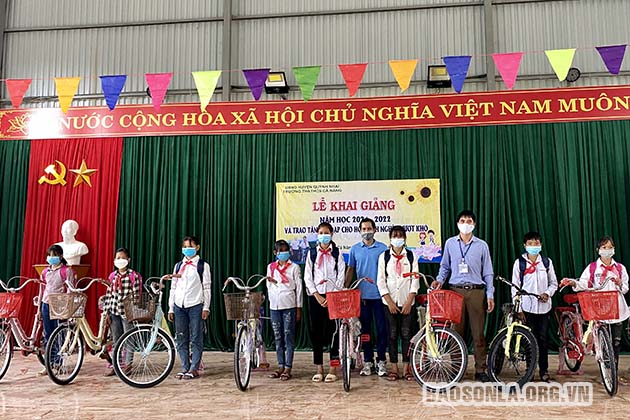 10 élèves du collège-lycée de Cà Nàng, dans le district de Quynh Mai, reçoivent les bicyclettes offertes par l’association Mai Châu. Photo : baosonla.org.vn