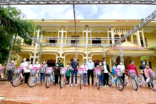 L’association Mai Châu et les soldats du poste-frontière de Chiêng On offrent des bicyclettes à 10 élèves défavorisés du collège-lycée des minorités ethniques de Chiêng On, dans le district d’Yên Châu. Photo: baosonla.org.vn