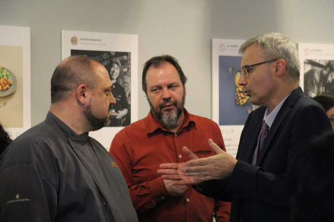 Thierry Vergon, le directeur de l'Espace (centre) et l'ambassadeur français Nicolas Warnery (droite) échangent avec le chef cuisinier de 3 Spoons (InterContinental Hanoi Lanmark72) |