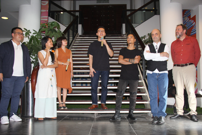 Nguyên Hoàng, photographe et fondateur de Chimkudo (gauche), Mai Nguyên Anh, scénographe (centre au micro), Hai Lê Cao, photographe (tshirt noir) et Fabien Jacob, artiste visuel |
