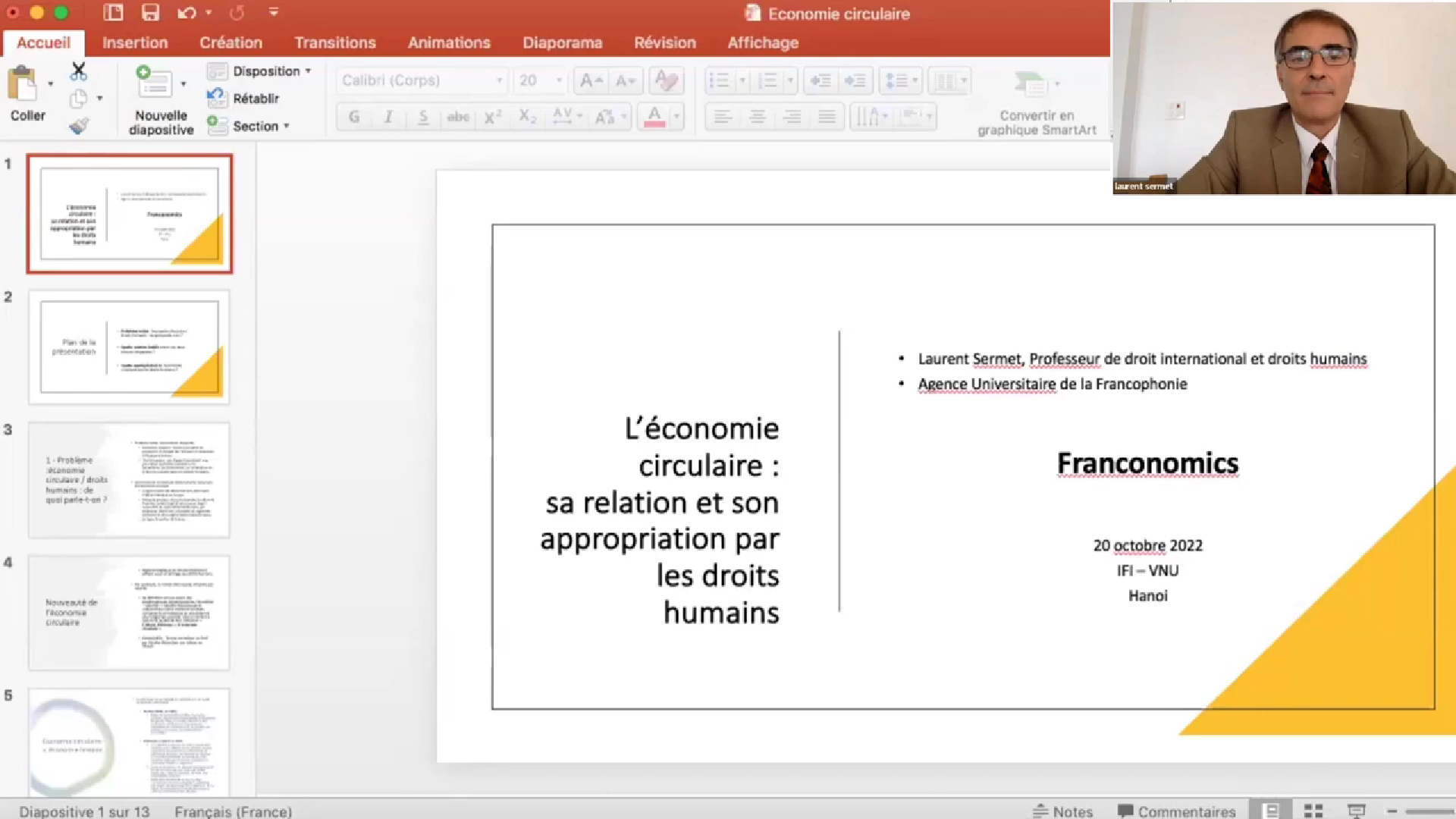 La journée s’est poursuivie avec une séance plénière à laquelle a participé le directeur de l’Agence universitaire de la francophonie pour l’Asie-Pacifique, Laurent Sermet, qui est intervenu à distance avec une présentation portant sur l’appropriation de l’économie circulaire par les droits humains. S’en sont suivies trois discussions en groupe pour autant de sujets : «Économie circulaire-clé du développement durable», «Nouvelles technologies au service de l’économie circulaire» et «Interactions entre l’économie circulaire, la structuration de chaînes de valeur et la coopération Sud-Sud et tripartite».