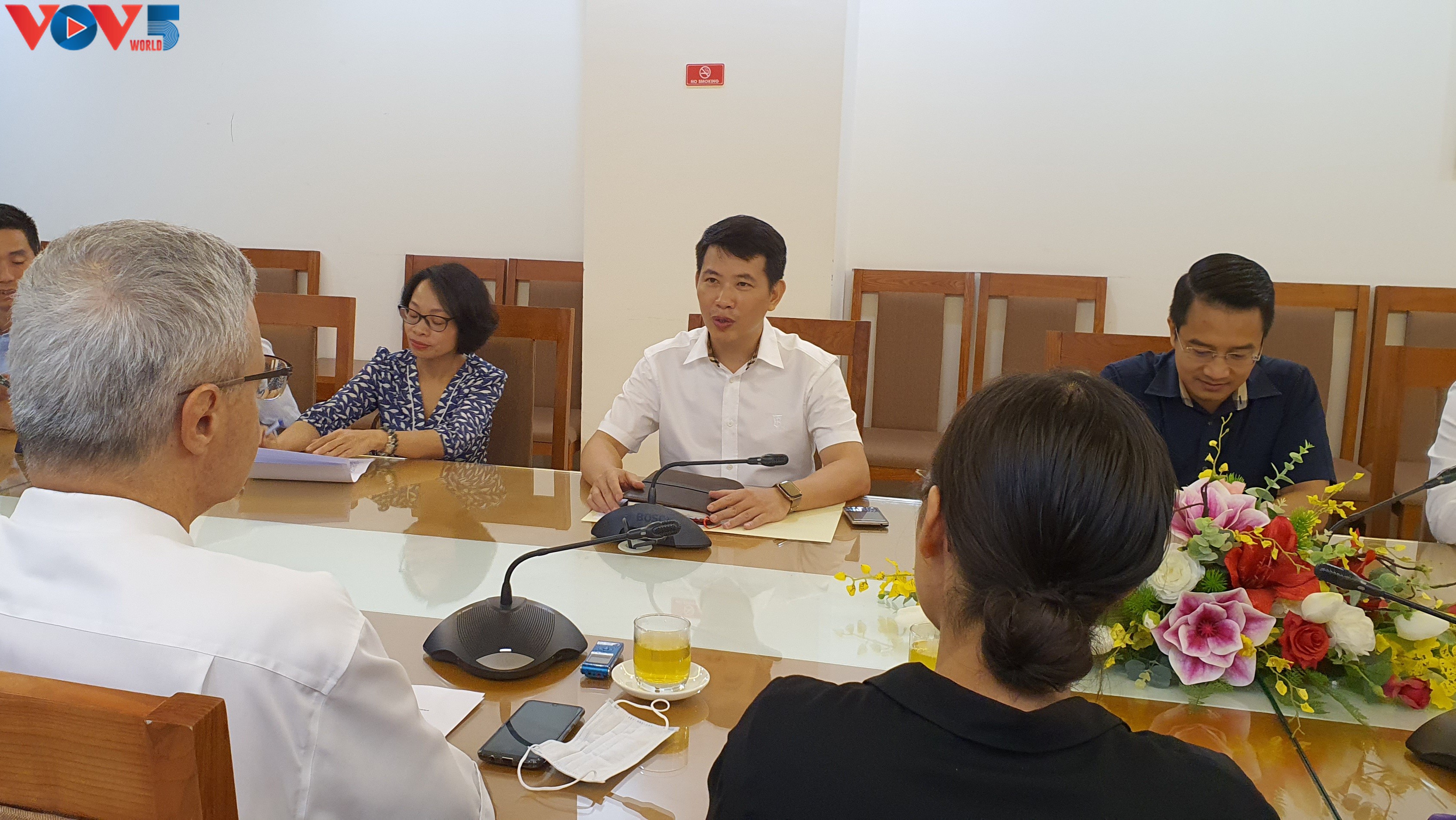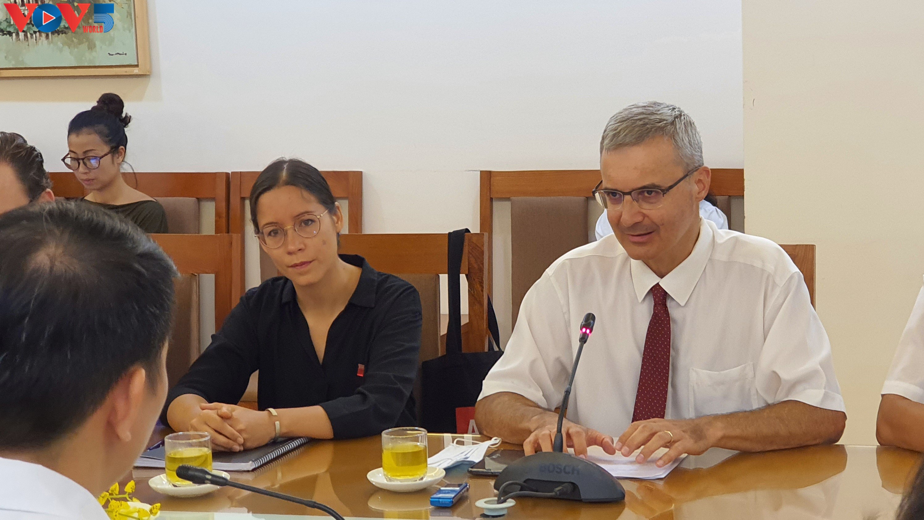 Nicolas Warnery, l’ambassadeur de France au Vietnam (à droite) travaille avec les autorités de l'arrondissement de Hoàn Kiêm. Photo: Duc Quy/VOV5 |