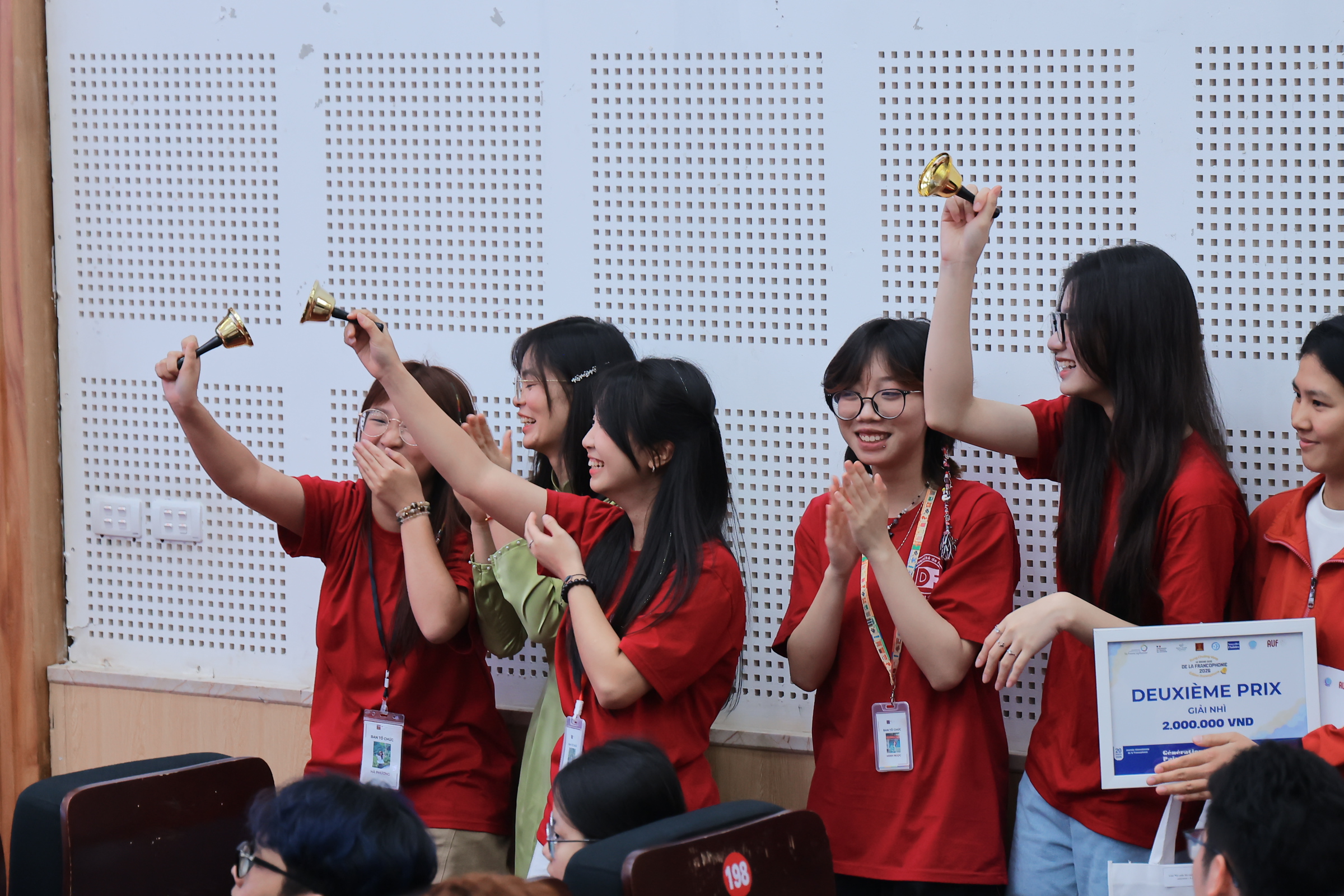 Des étudiantes encouragent chaleureusement leurs camarades sur scène au son des clochettes. Photo: Département de français - Université de Hanoi |