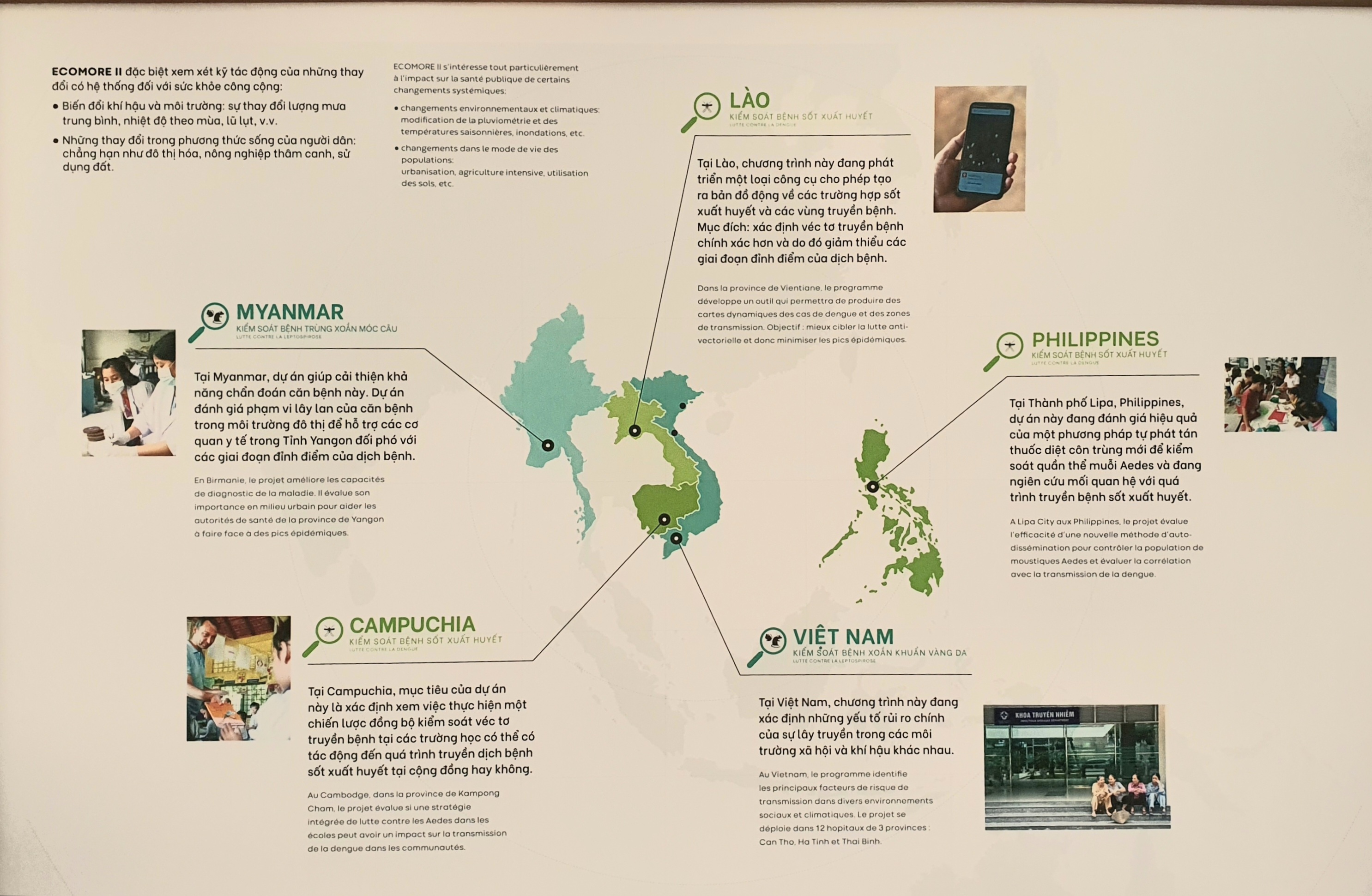 Lancé depuis 2013, le projet Ecomore (Economic development, ecosystem modifications, and emerging infectious diseases risk evaluation) introduit des études sur le lien entre croissance économique, scénarios climatiques et maladies émergentes en Asie du Sud-Est.