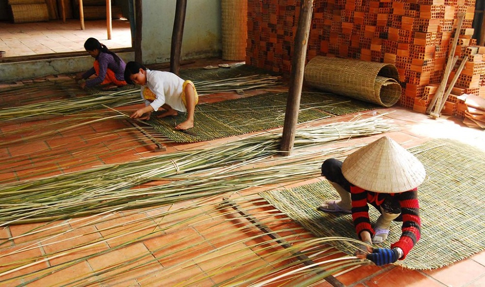Dans le village de My Trà, les artisans continuent de produire des nattes à un rythme soutenu. Chaque jour, un artisan peut tresser entre huit et dix nattes. Même les seniors ne rechignent pas à venir prêter main forte…