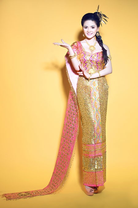 « Le jour J, la mariée porte un «sampot hol» pourpre ou rose foncé. En haut, elle porte soit une chemise courte, soit une longue veste rouge appelée «tam pong», avec une écharpe portée en travers du torse. Elle est également parée de splendides bijoux : des diadèmes ou des tiares incrustés de pierres étincelantes, des bracelets ciselés... Son conjoint, lui, porte un « sampot hol » enroulé autour de la taille et fixé par une ceinture, une veste courte à longues manches boutonnée au milieu. A la taille, il a un couteau, pour montrer qu’il protègera sa bien-aimée. »