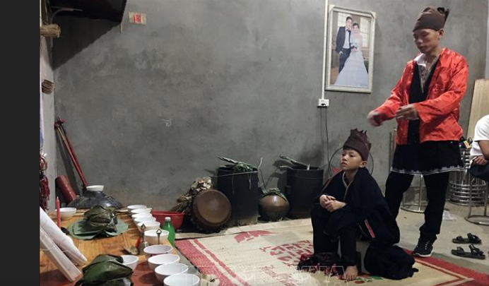 Quatre bols de riz, quatre bols d’alcool de riz, une jarre d’alcool, un poulet bouilli et un cochon cru, voilà les éléments indispensables composant le plateau d’offrandes présenté sur l’autel des ancêtres lors du «baptême» Dao tiên. Deux chamans conduisent la cérémonie. Le premier invoque les ancêtres en frappant trois coups sur un objet symbolisant le yin et le yang, avant de lire une prière.