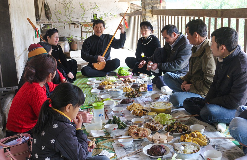Direction Binh Liêu, un district montagneux de la province de Quang Ninh. Au dernier jour de l’année lunaire, la famille de La Thi Hông se retrouve au grand complet. Dès le petit matin, son fils cadet a ramené de la forêt un beau bambou au tronc tout droit et au feuillage touffu qu’il a érigé sur la terrasse. Son fils aîné et sa femme ont rangé et nettoyé la maison, et les meubles dépoussiérés ont repris leur éclat. Des morceaux carrés de papier rouge ont été collés sur l’autel des ancêtres, sur la porte principale et sur les arbres. Dans un coin de la maison, la pioche, la charrue et le panier de paddy sont rangés, «scellés» aussi d’un papier rouge carré, qui est pour les Tày une sorte d’ordonnance de repos méritée après une année de travail.