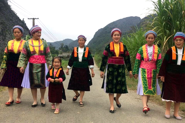 Un vêtement typique de la femme Mông comprend un turban, un haut plutôt collant et une jupe plissée. Les Mông accordent moins d’importance aux motifs de décoration qu’au mélange de couleurs et de matériaux. Leurs vêtements comportent en effet des assemblages entre des morceaux sans décoration et des morceaux peints ou brodés.