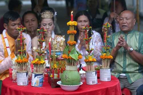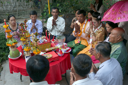 Chez les Khmers, même si le mariage est une institution civile, la cérémonie religieuse est beaucoup plus importante. D’ailleurs des bonzes sont conviés. Ils récitent généralement des prières en aspergeant le couple d’eau bénite parfumée, en signe de bonheur et de longévité. Ensuite, ils lient les mains des jeunes mariés avec un fil de coton rouge, pour signifier qu’ils sont désormais unis à tout jamais, pour le meilleur et pour le pire.