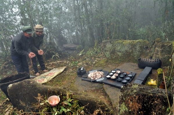 Petite précision : cet évènement, également nommé «cérémonie d’interdiction du village», ne réunit que les villageois. Tous les étrangers en sont exclus. Il se déroule juste à l’entrée du village où l’on érige un autel pour y déposer les traditionnelles offrandes : un cochon, un coq et une assiette de «xôi» - du riz gluant cuit à la vapeur - de couleur jaune vive. Nguyen Hung Vy, folkloriste :