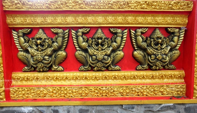De loin, le monument bouddhique, emblématique de l’architecture khmère méridionale, se distingue par une toiture dorée à deux niveaux et des bas-reliefs en forme de lotus. Naga, le serpent sacré du bouddhisme thérévada, trône aux quatre extrémités de la toiture, soutenue par une rangée de colonnes ornées de la déesse Kemnar à chaque arbalétrier.