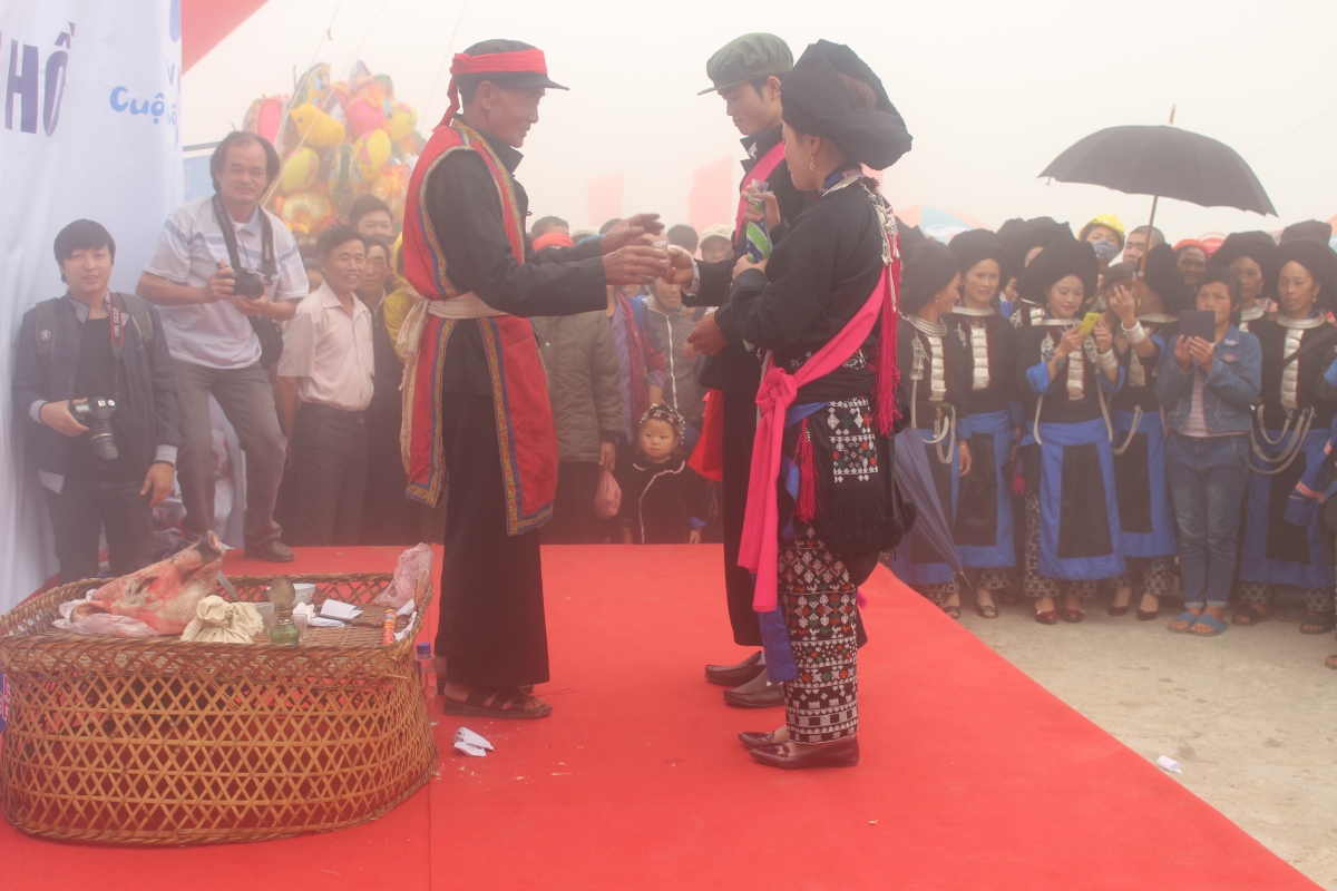 L’une des particularités de cette cérémonie est la participation de 12 garçons de moins de 12 ans, qui ont pour mission de faire du bruit et de créer une ambiance festive. Sur fond de musique, les garçons font semblant de boire, de manger en poussant des cris joyeux. Ils se dissipent quand la musique a fini. C’est à ce moment-là que l’entremetteuse se met à maquiller la mariée et le mari, comme nous l’indique Tân My Xoang, une entremetteuse chevronnée de la commune de Ta Phin.