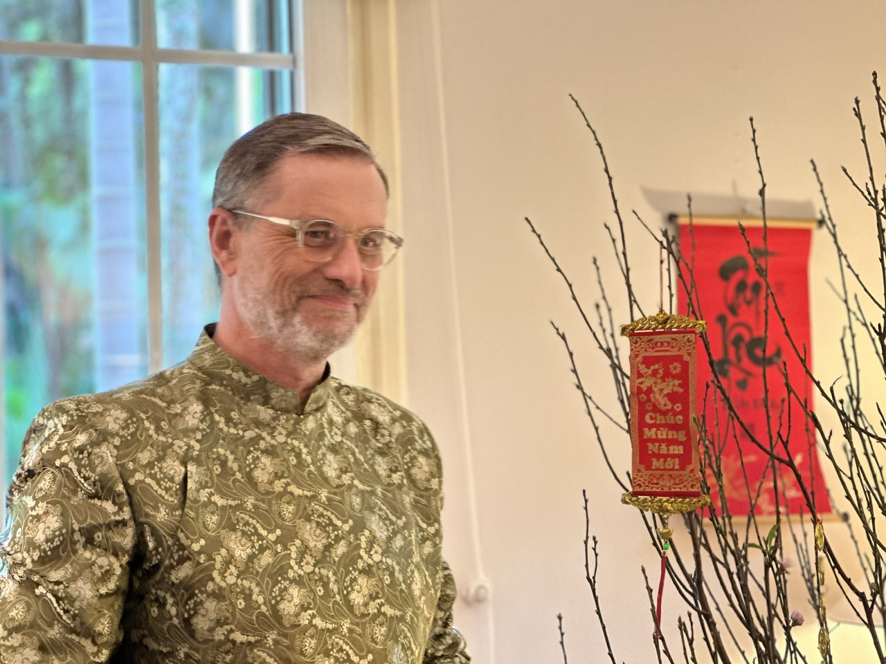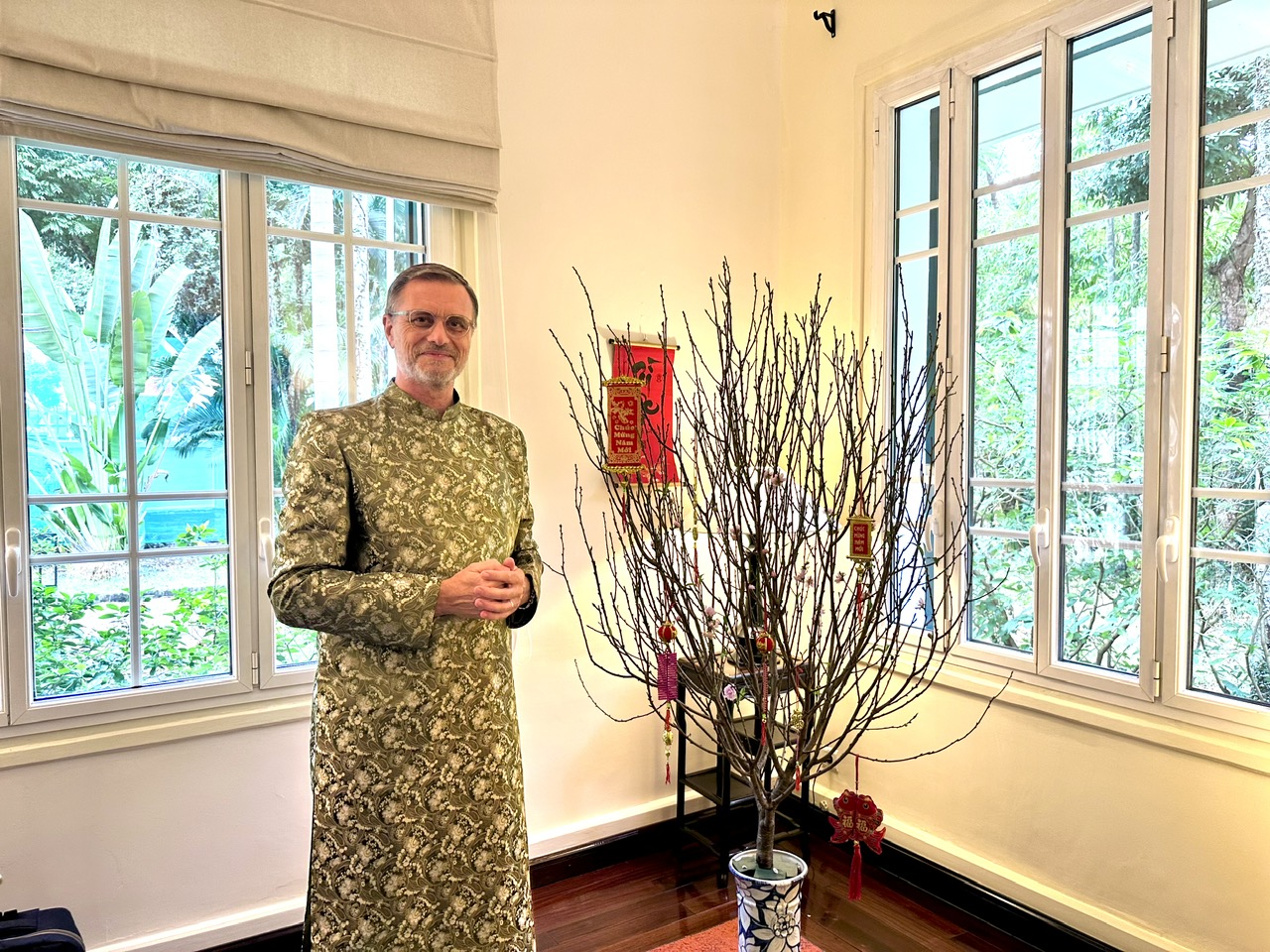 L'Ambassadeur de France au Vietnam Olivier Brochet pose près d'une branche de pêcher du Têt. Photo: Thy Loan |