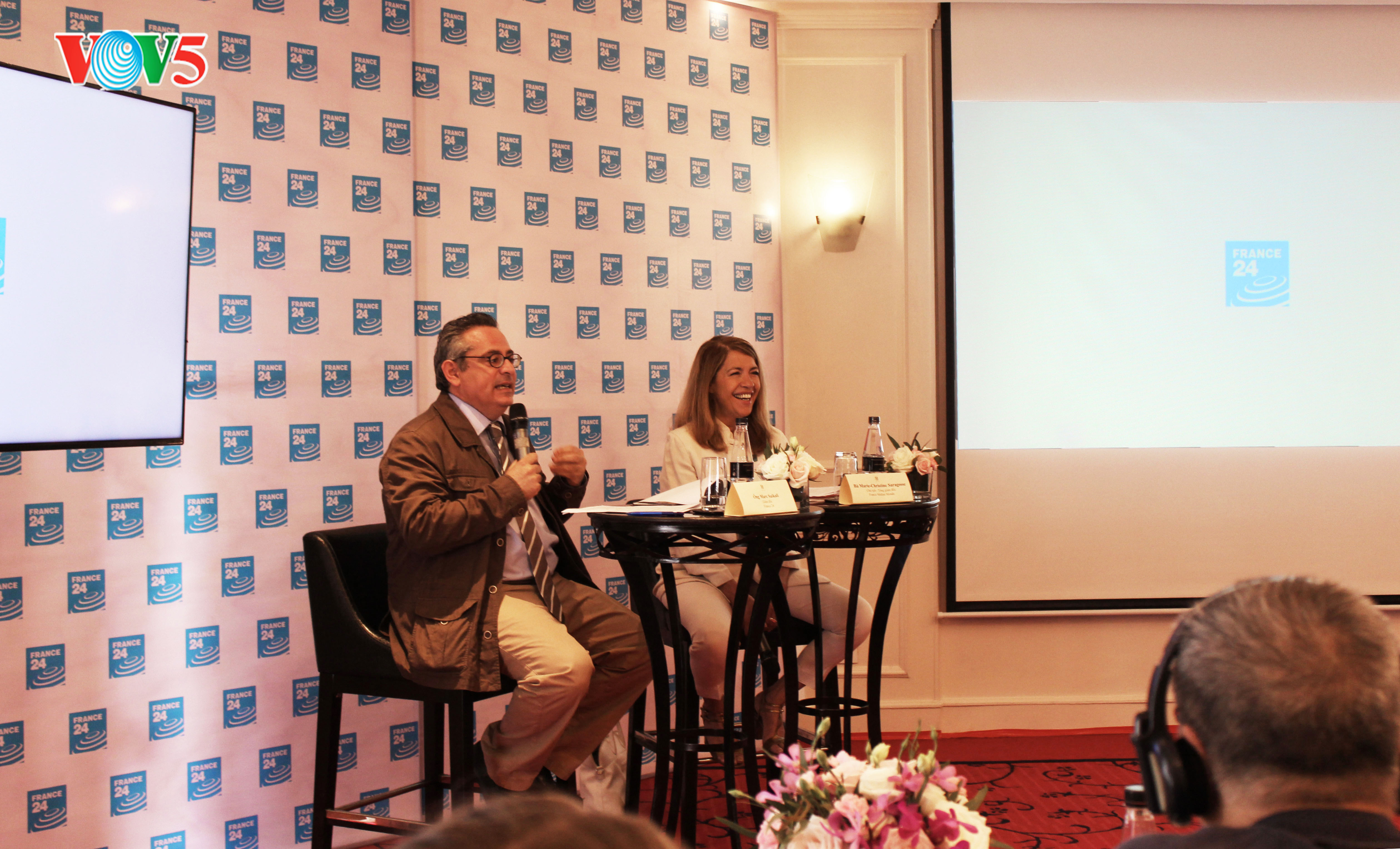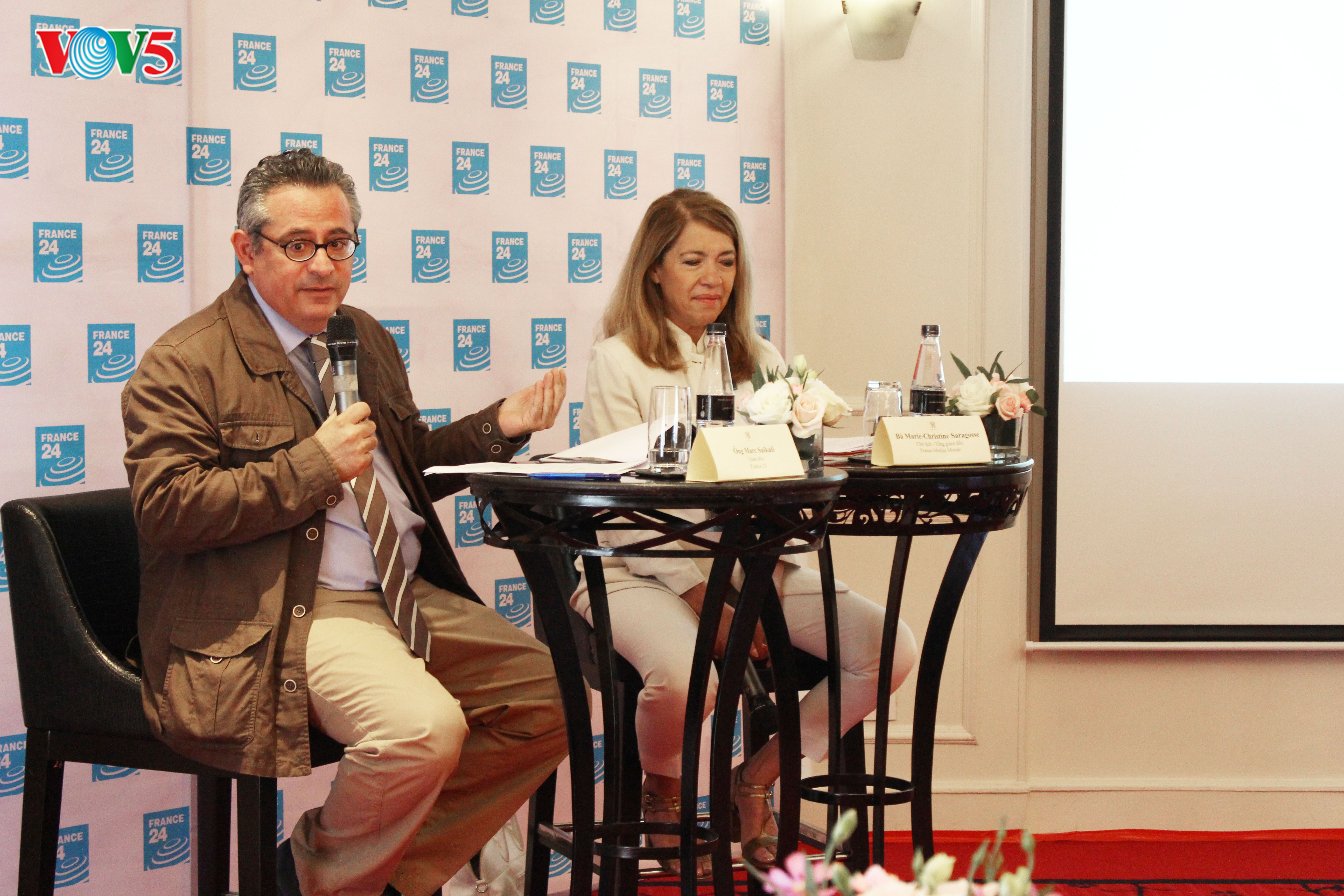 Marc Saikali, le directeur de France 24 et Marie-Christine Saragosse, présidente-directrice générale du groupe France Médias Monde lors de la conférence de presse sur le lancement de France 24 au Vietnam. Photo: Duc Quy/VOV