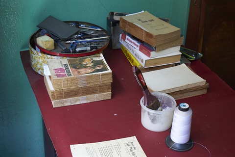 Des ciseaux, de la colle, du fil, des aiguilles, un coupe-papier… Excepté bien sûr un solide savoir-faire, il n’en faut pas plus pour être relieur… Chaque semaine, Vo Van Rang reçoit une dizaine de livres qui lui sont envoyés par des bibliophiles de tout Hô Chi Minh-ville, et parfois même des régions alentours.