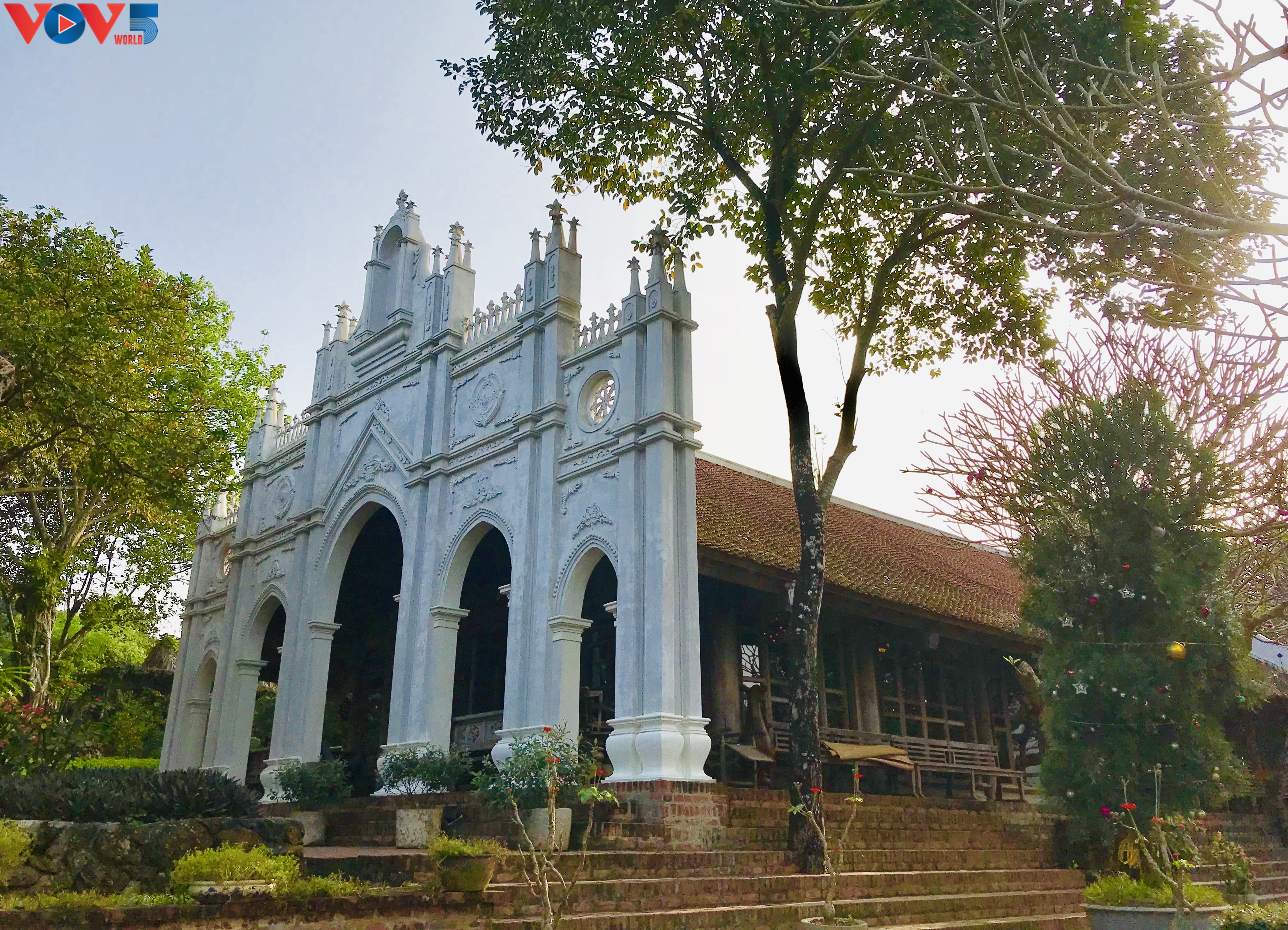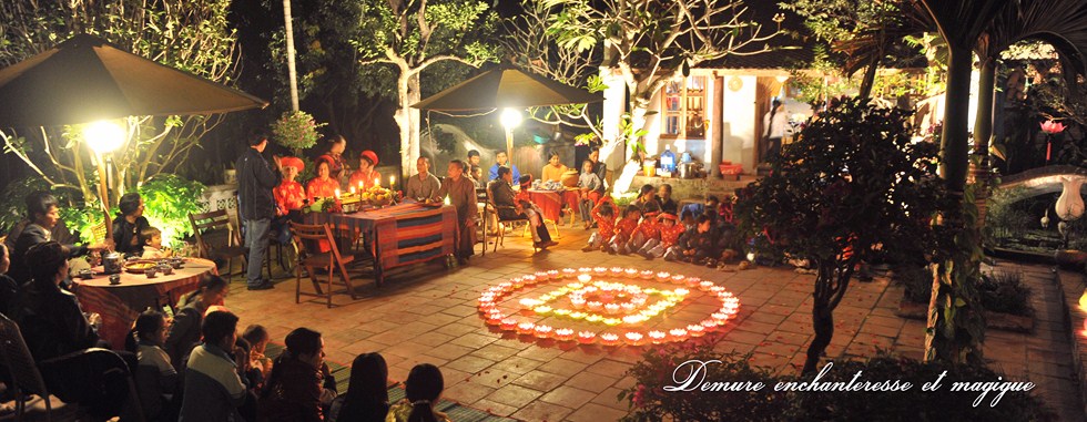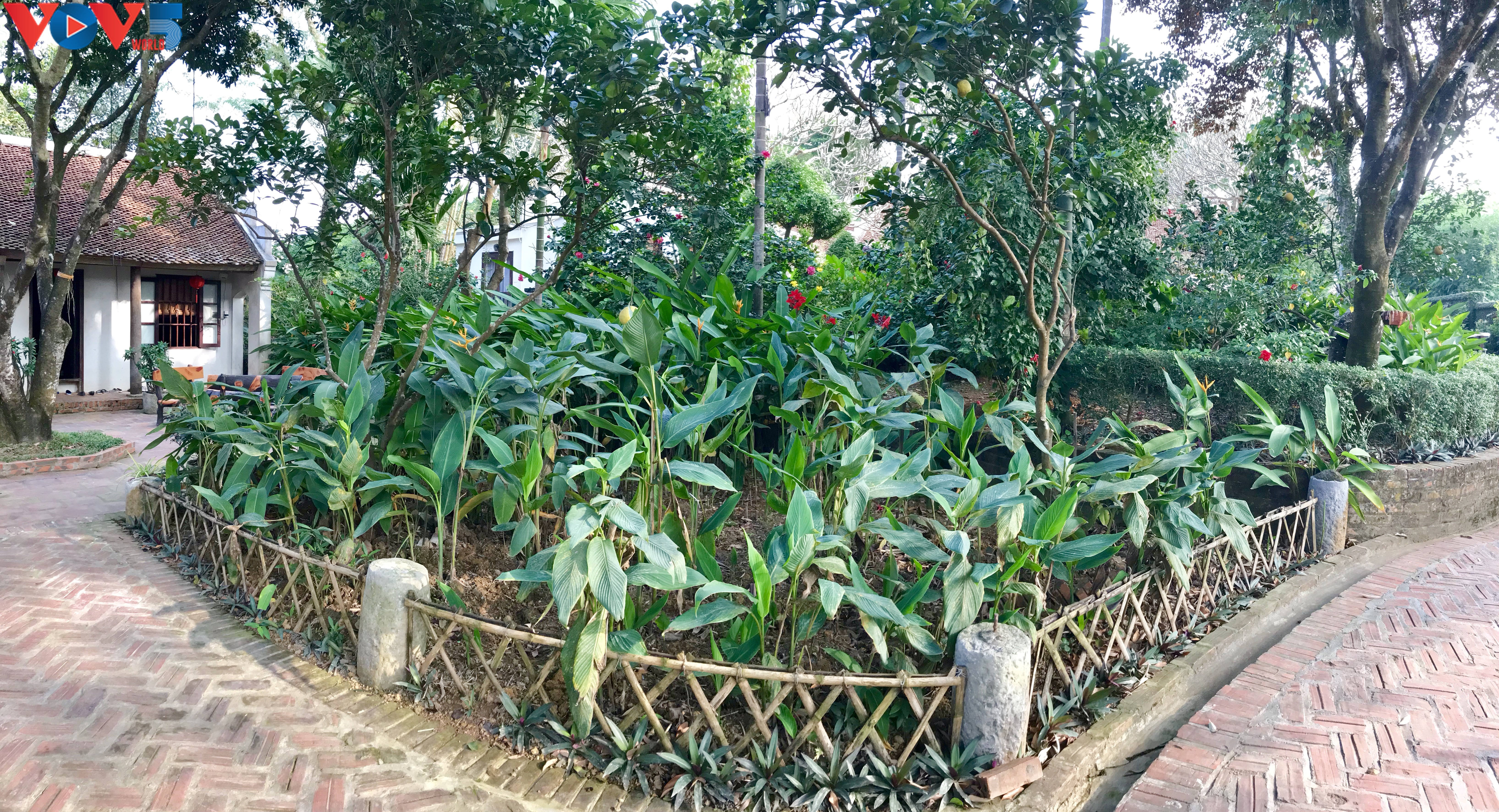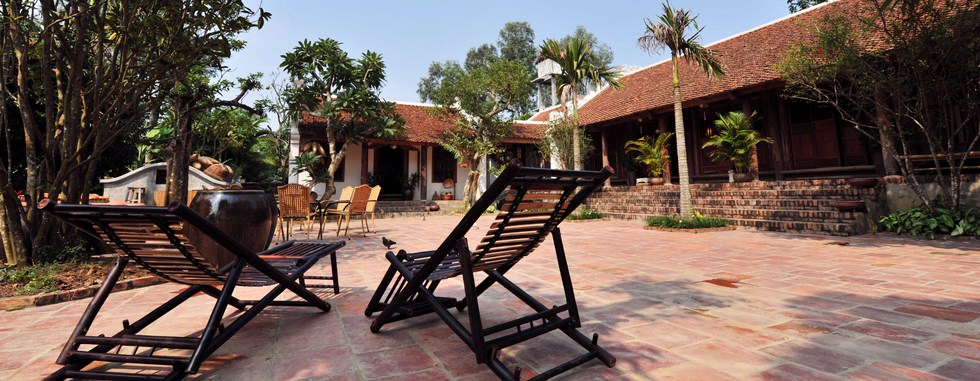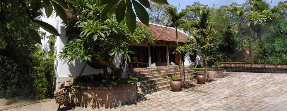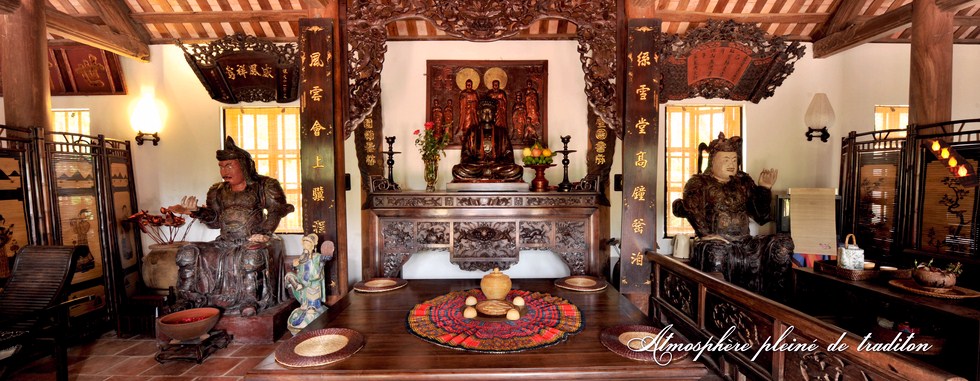 «Depuis dix ans qu’il existe, notre gîte comporte aujourd’hui quatre maisons anciennes: la maison des manguiers, la maison des pamplemoussiers, la maison des frangipaniers, la maison des goyaviers, qui portent le nom des arbres du jardin», nous indique Nguyên Khanh Tùng, le manager du lieu. «Vivre dans ces maisons à trois travées, c’est l’occasion de découvrir l’architecture typique de la campagne du delta du fleuve Rouge d’autrefois avec le toit couvert de tuiles Yin-Yang, le mur, les portes et les colonnes en bois. Elles sont décorées avec des sentences parallèles, des objets antiques et des meubles ornés de sculptures traditionnelles: lotus, fleurs du pêcher, phénix, dragon… Mais nous avons aussi une maison sur pilotis qui a la capacité d’accueillir au maximum 20 personnes et une ancienne église qui sert pour des repas… Ça peut surprendre, mais en fait, c’est une église désaffectée, qui a été reconvertie».