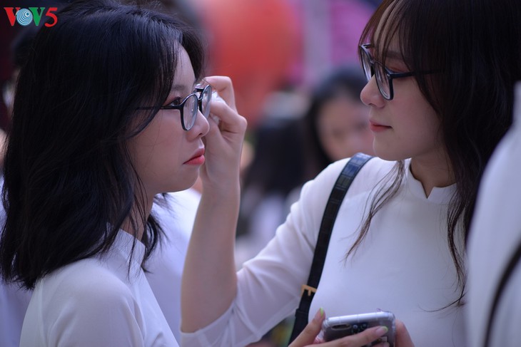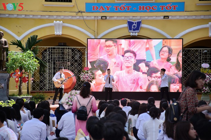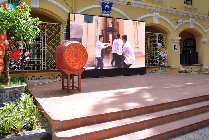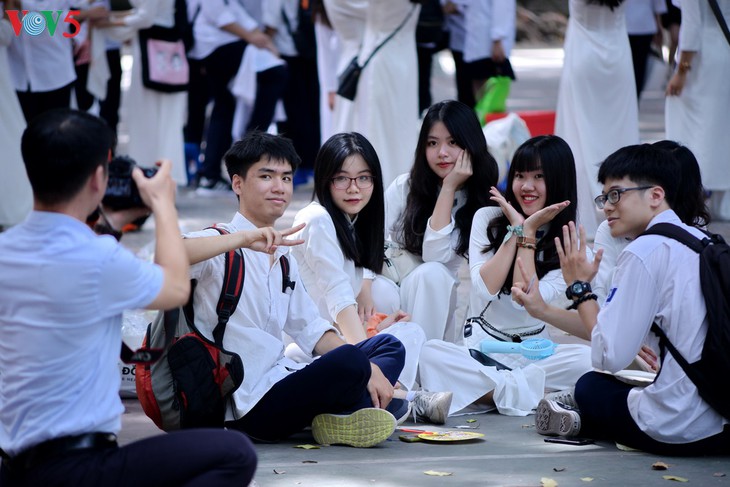 Dans la cour du lycée Viêt Duc, un fond en grand format avec des milliers de signature et de voeux des élèves de terminale.