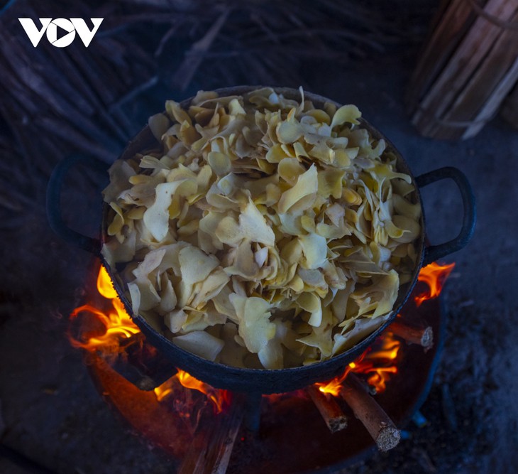 Elles sont ensuite bouillies, égouttées et cuites avec du sucre. La cuisson est l’étape cruciale qui décide de la qualité du produit fini. Elle doit s’effectuer au feu de bois. Il faut remuer régulièrement et veiller à ce que les tranches ne collent pas les unes aux autres.