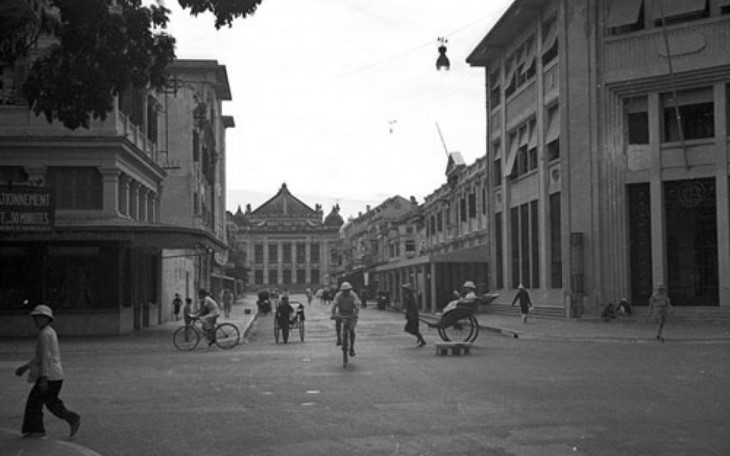 Le carrefour Paul Bert-Henri Rivière (noms actuels : Tràng Tiên-Ngô Quyên). L’Opéra de Hanoï se trouve au fond de la rue Paul Bert. |