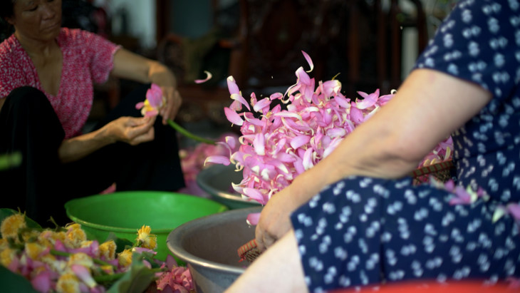 En fonction de chaque saison et de chaque étang de lotus, l’artisan décide du nombre d’opérations de parfumage, de 5 à 7 fois pour un kilo de thé. |