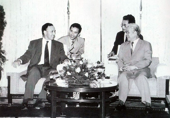 Dô Muoi accueille le sénateur John Kerry qui conduisait au Vietnam une délégation de parlementaires des deux chambres du Congrès et d’anciens combattants américains, le 1er juin 1993. |
