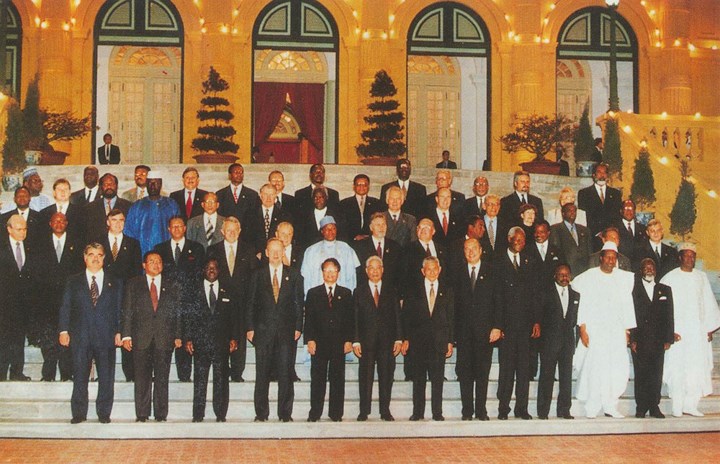 Dô Muoi en photo de famille avec les chefs d’État et de gouvernement et les autres chefs des délégations participant au 7e Sommet de la Francophonie à Hanoï, le 14 novembre 1997. |