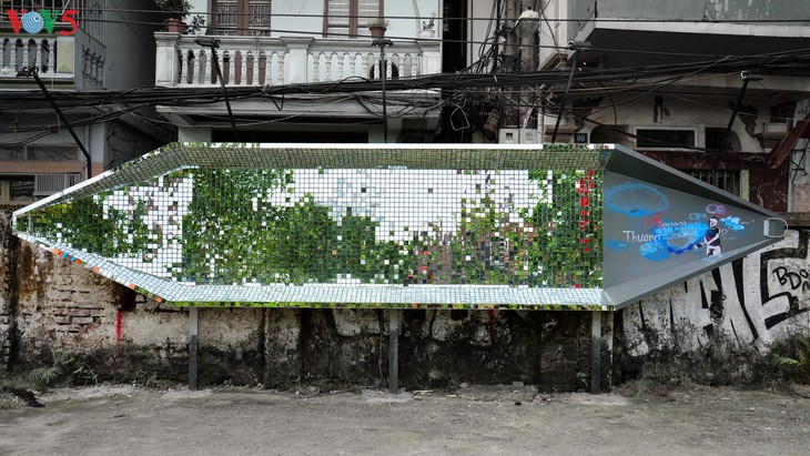 Ce sampan de 7 mètres de long est fait à partir de 5000 morceaux de verre. Cette mosaïque reproduit les petites embarcations utilisées par les Hanoiens vivant au bord du fleuve Rouge en cas de crue.