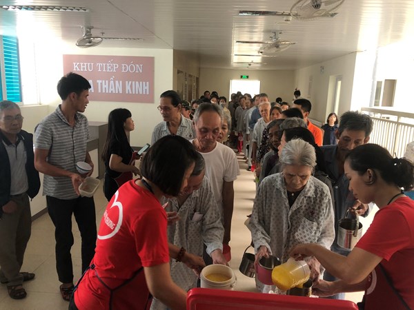 Trois fois par semaine, le mardi, le samedi et le dimanche, vers 14h, le groupe apporte aux patients pauvres des milliers de bols de potage de riz bien chaud. Ceux qui ne peuvent pas venir faire la queue recevront leur bol au lit, qui leur sera alors apporté par un membre du groupe. Nguyên Thi Bai, 70 ans, est toute émue de ce geste.