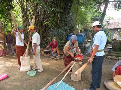 «J’ai commencé ce travail quand j’avais 17-18 ans. En moyenne, chaque jour, on prépare 60 kilos de riz pour obtenir 80 kilos de cốm dẹp. Mais au moment des fêtes, on peut préparer 80 kilos de riz par jour. Autrefois, on faisait du cốm dẹp principalement pour l’Ok Om Bok, mais à présent, nos produits se vendent bien durant toute l’année, non seulement dans la région, mais aussi à Soc Trang, à Vinh Long et à Ho Chi Minh-ville.»