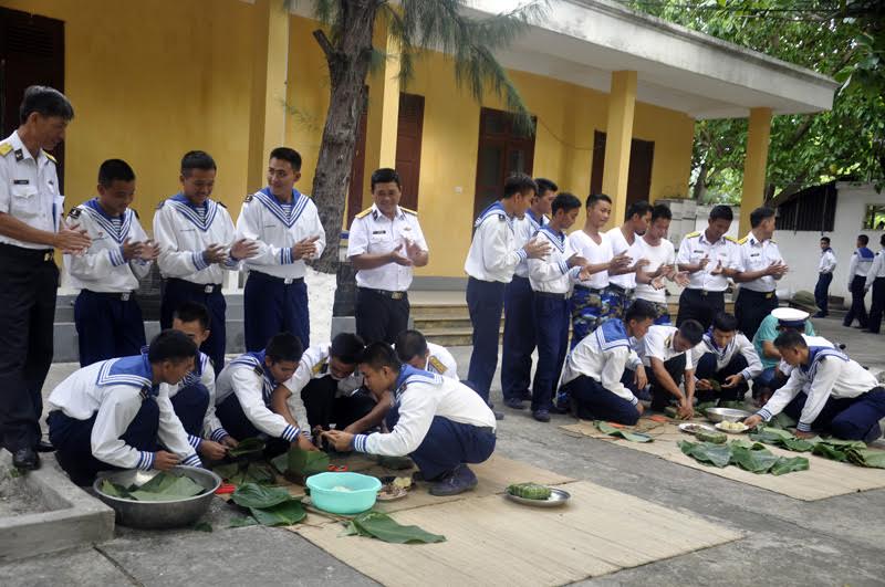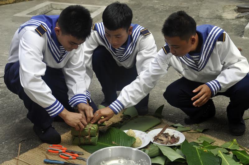Les feuilles de phrynium bien lavées et coupées sont disposées dans les moules. Les ficelles de bambou sont déjà trempées dans l’eau, ce qui les rend plus souples. Quant aux haricots mungos, ils sont cuits, pilés et tassés en boule. Tout est prêt. Sous les mains habiles des soldats, en à peine cinq minutes, un gâteau est fait. Mais il faut savoir que sur les îles de Truong Sa, outre les feuilles de phrynium, on utilise aussi des feuilles de bàng vuông, un badamier typique des îles de l’océan indien et du Pacifique Ouest dont le nom scientifique est Barringtonia asiatica. Le capitaine Le Dang Sang: