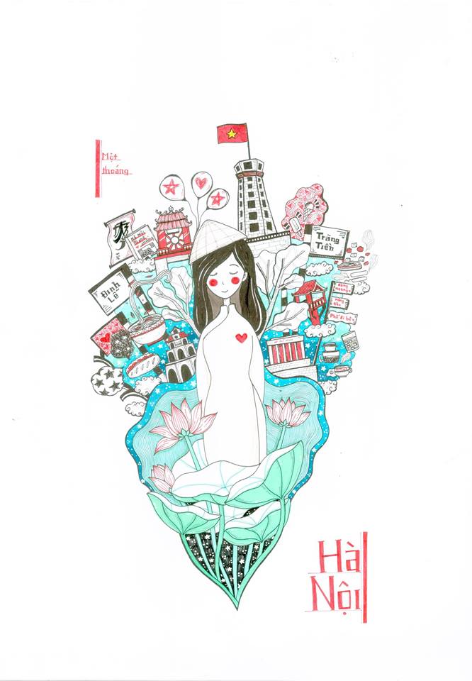 Née en 1997, Vu Thi Thanh Thu a dessiné sa ville, Hanoï, en utilisant principalement deux couleurs, le bleu représentant une ville paisible et le rouge pour l’ardeur de sa population. Son tableau intitulé «Un instant hanoïen» est un condensé de clichés gravés dans la mémoire collective, de lieux et de plats célèbres, de lotus avec au milieu de la toile, une fille charmante et timide en ao dai (prononcé «ao zaï», tenue traditionnelle de l’ethnie majoritaire Kinh) portant un chapeau conique. C’est avec cette scène que Vu Thi Thanh Thu a obtenu le premier prix du concours.
