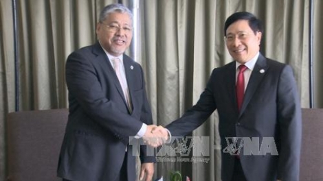 (VOVworld) - En marge du 30ème sommet de l’ASEAN en cours à Manille, aux Philippines, le vice-Premier ministre et ministre des Affaires étrangères Pham Binh Minh a rencontré ce vendredi matin le ministre par intérim des Affaires étrangères du pays hôte Enrique Manalo.