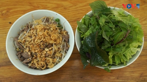(VOVWORLD) - Le bun bo Nam Bô est une salade de vermicelles de riz froids, accompagnée de bœuf sauté, de cacahuètes, de germes de soja, d’herbes aromatiques et d’échalotes frites.
