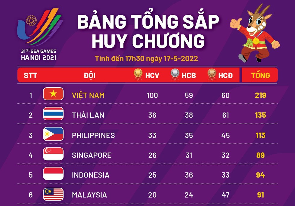 (VOVWORLD) - Pada pukul 19.00 pada tanggal 17 Mei, kontingen olahraga Vietnam memenangkan 219 medali semua jenis, di antaranya 95 medali emas, terus memelopori daftar klasemen SEA Games ke-31.