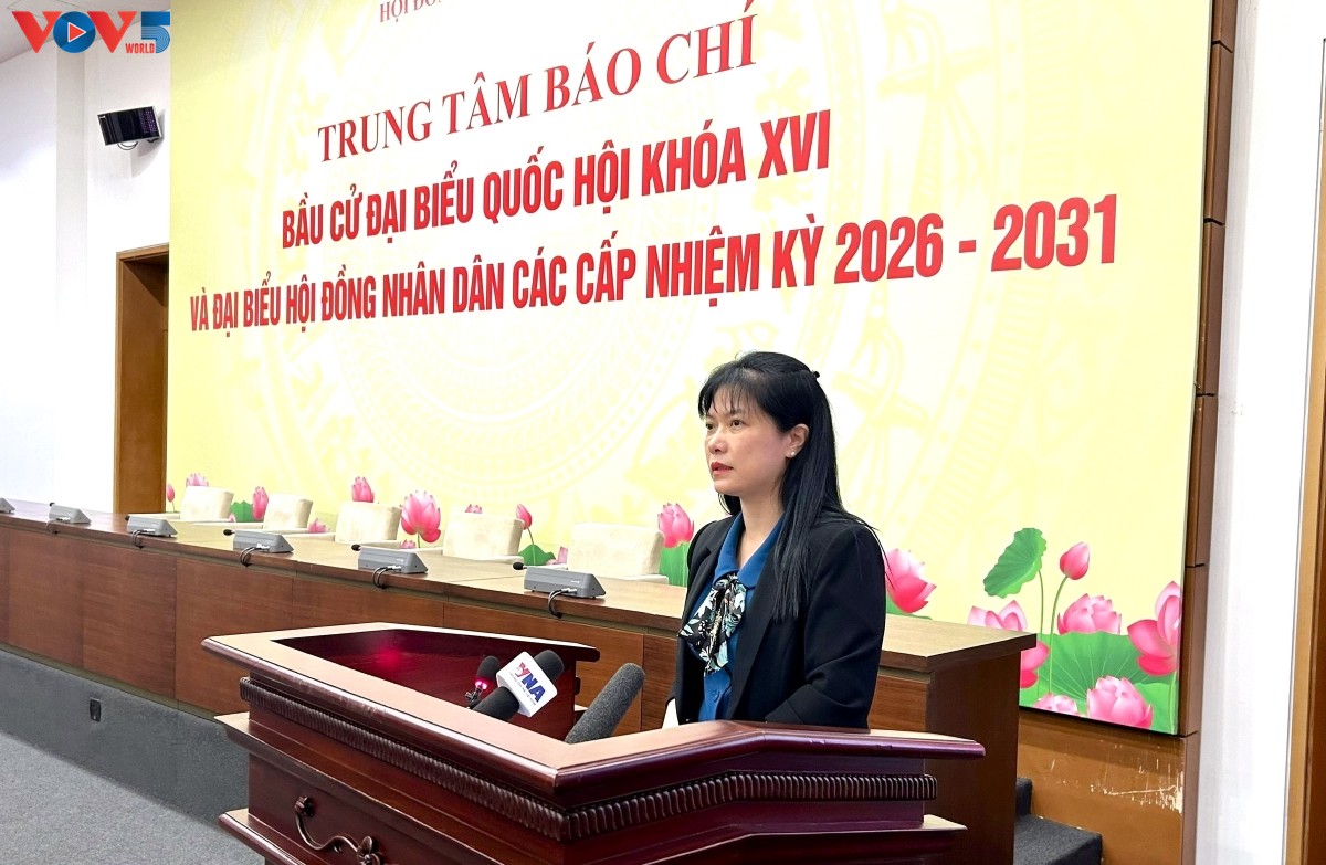 Ta Thi Yen, Wakil Kepala Harian Kantor Dewan Pemilihan Nasional menyampaikan informasi kepada kalangan pers (Foto: Nguyen Nhung/VOV)