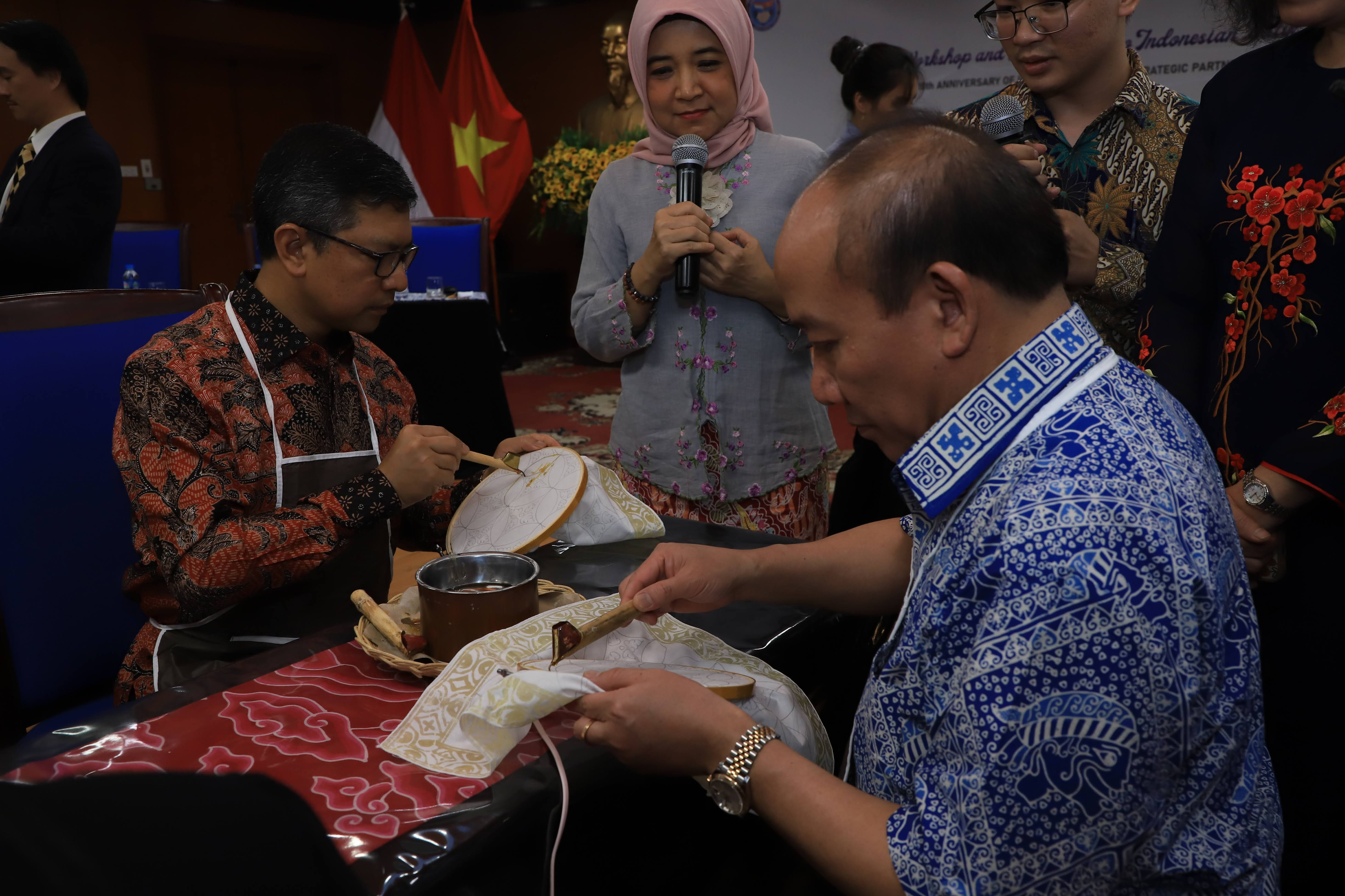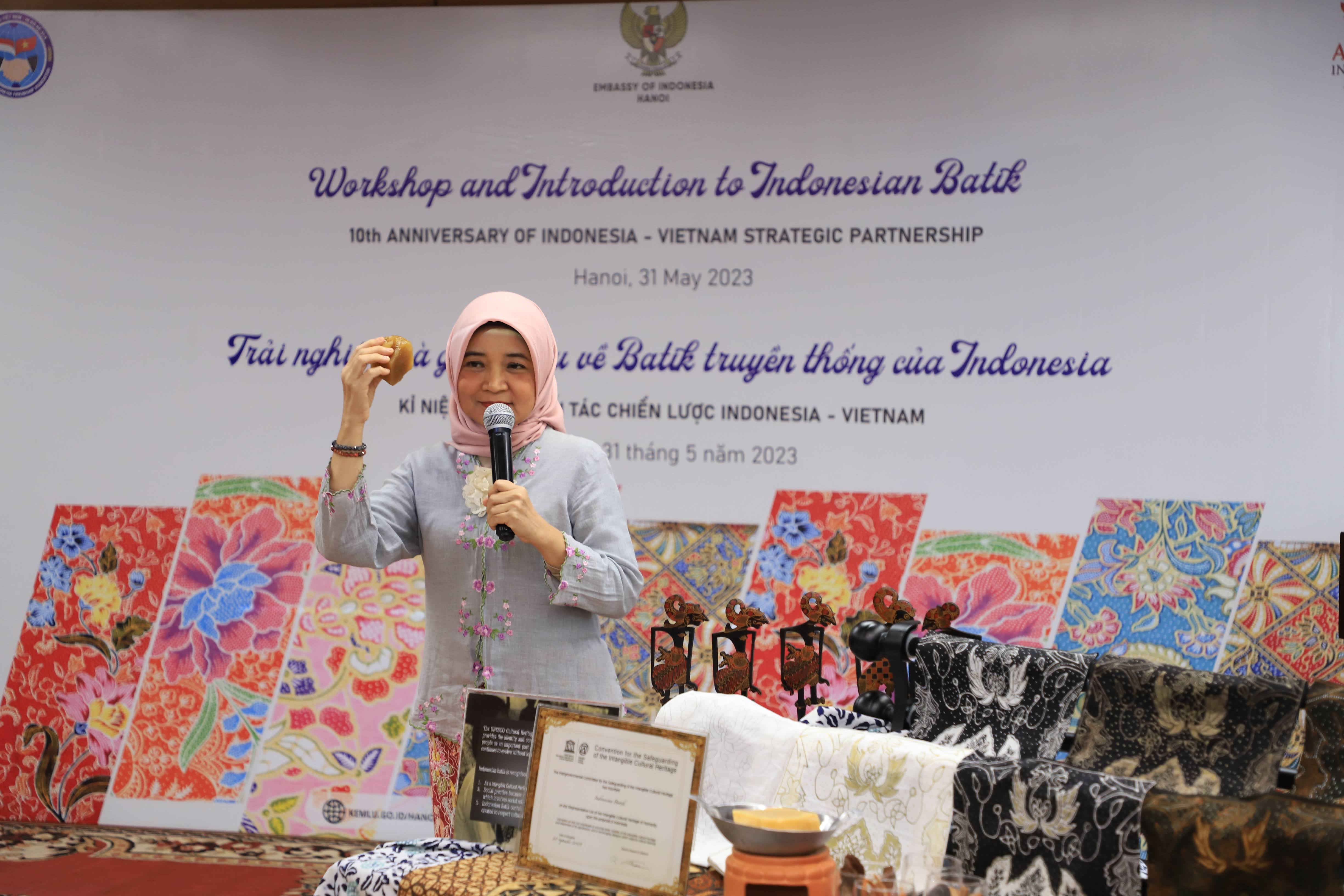 “Lokakarya Batik Indonesia hari ini berada dalam rangkaian kegiatan-kegiatan silaturahmi kebudayaan untuk memperkuat pengertian antara rakyat dua negeri. Melalui itu juga merupakan peluang untuk mendorong lebih lanjut hubungan antara kedua belah pihak di semua bidang, khususnya kebudayaan dan pariwisata. Batik Indonesia telah diakui oleh UNESCO sebagai warisan takbenda dari umat manusia pada tahun 2009 (bersama waktu dengan Lagu Rakyat Quan Ho dari Vietnam). Hal itu menunjukkan bahwa Batik tidak hanya seni saja, melainkan juga adalah kebudayaan, mengandung nilai jiwa, rasa dan kehidupan warga Indonesia”.
