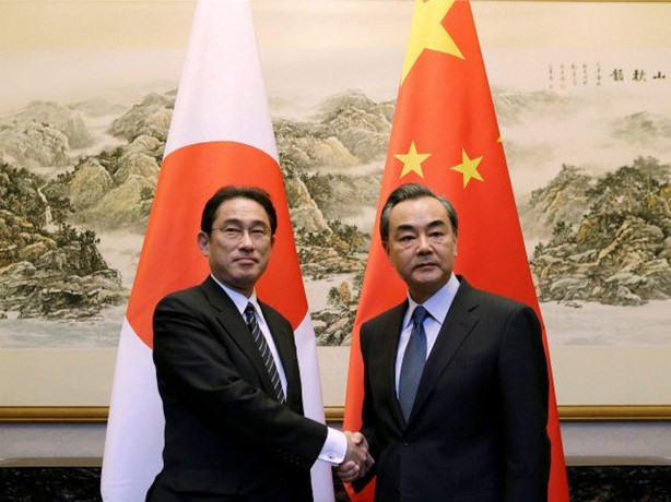 Menlu Jepang, Fumio Kishida (kiri) dan timpalannya dari Tiongkok, Wang Yi