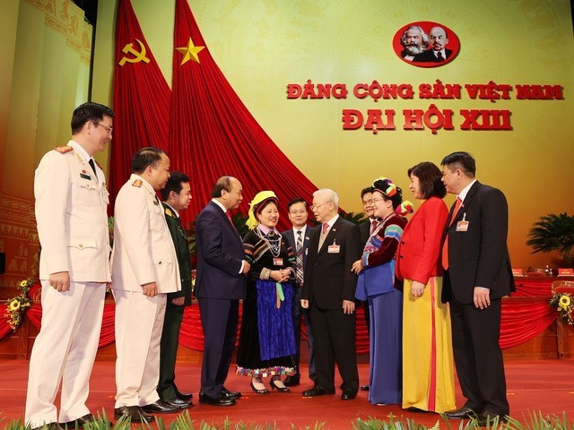 Sekjen, Presiden Nguyen Phu Trong dan Perdana Menteri Nguyen Xuan Phuc bersama dengan para utusan di sela-sela Kongres . (Foto: Kantor Berita Vietnam) |