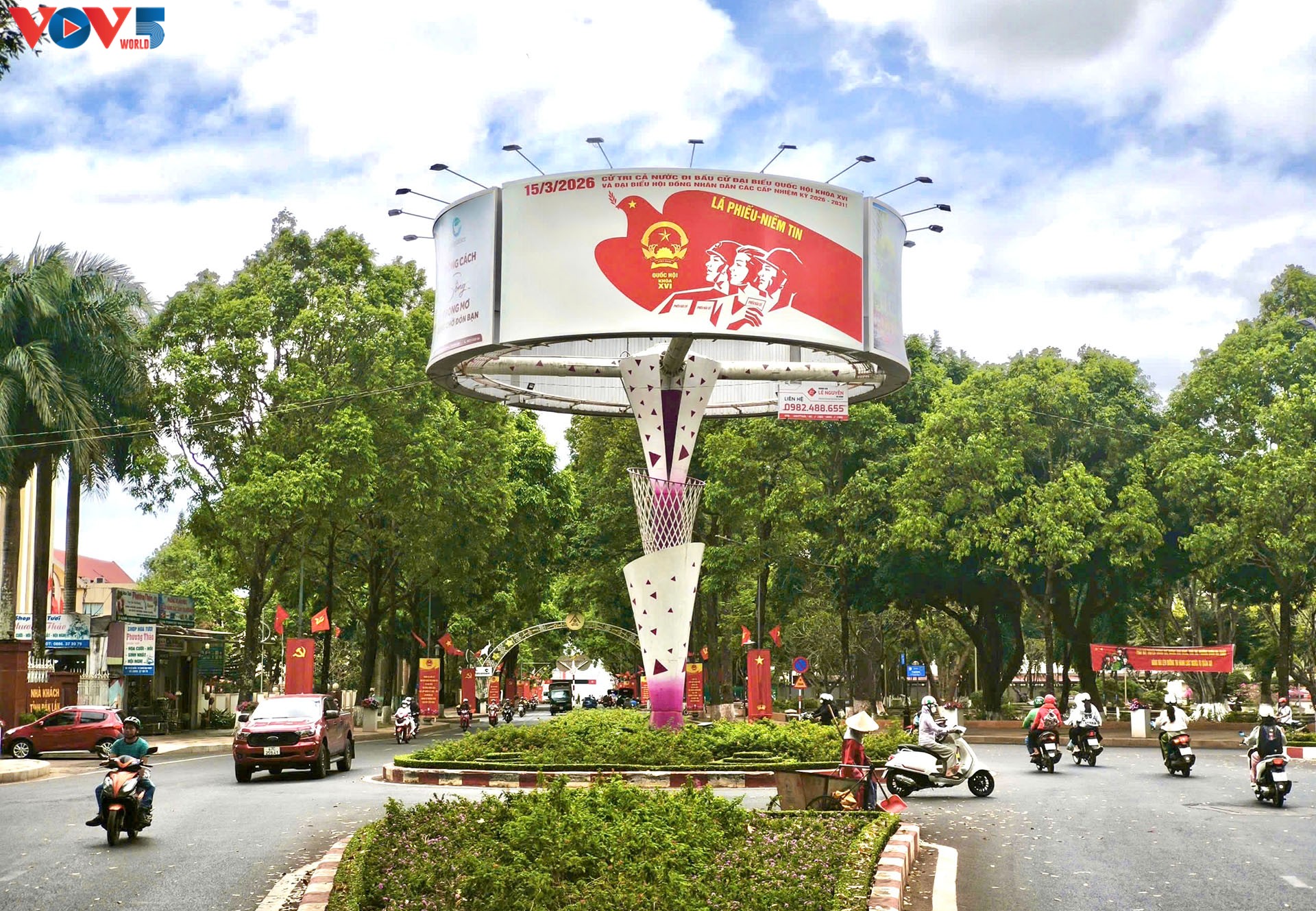 Banyak jalan dan zona permukiman di Provinsi Dak Lak dihiasi dengan papan reklame, spanduk, dan poster pemilu secara meriah. Foto: VOV |
