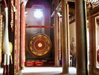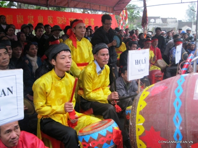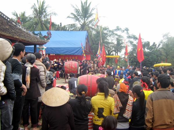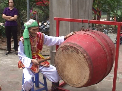 Di halaman kuil ada kira-kira lima orang pria yang berusia dari 60 tahun ke atas sedang asyik menabuh genderang. Ini merupakan satu latihan menabuh genderang pemujaan untuk membuat persiapan hari pesta desa yang berlangsung pada tanggal 3 bulan pertama menurut kalender Imlek. Suara genderang pemujaan memainkan peranan yang penting dalam kehidupan spiritualitas rakyat di desa-desa. Genderang pemujaan adalah ragam musik spiritualitas yang sudah ada sejak lama dan selalu dimainkan pada hari-hari pesta yang penting dari desa atau marga. Kieu Trung Hieu, seorang penabuh genderang pemujaan memberitahukan: “Setelah suara genderang pemujaan bergema, warga desa mengetahui bahwa pada hari ini di desa berlangsung upacara pemujaan di kuil. Menabuh genderang pemujaan termasuk pada masalah spiritualitas, ia harus berhasil memasuki hati orang. Ketika suara genderang bergema, rakyat desa merasa terpesonadan angker, jadi bukan seperti suara genderang biasa”.