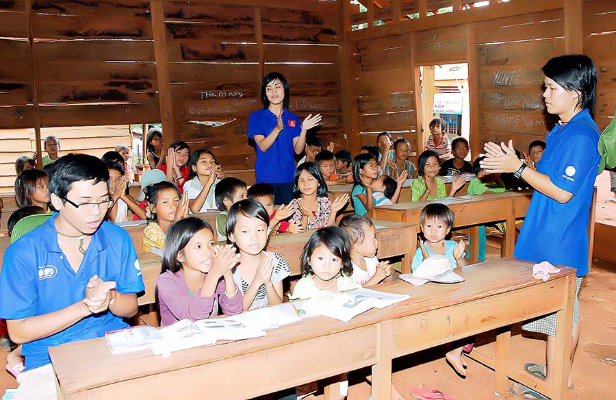 Para relawan dalam program sukarela musim panas hijau membantu para pelajar di daerah pegunungan belajar (Foto: Đ.T)