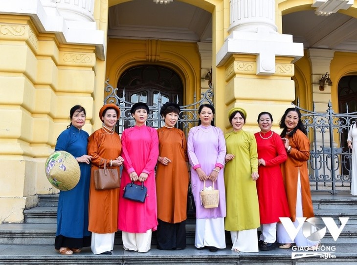 Memakai Ao Dai dan tuurn ke jalan tidak hanya untuk menyimpan momen yang indah saja, melainkan juga turut melestarikan dan menyebarkan intisari dan keindahan Ao Dai tradisional-Warisan Budaya Vietnam. Foto: Hai Bang/VOV Lalu Lintas