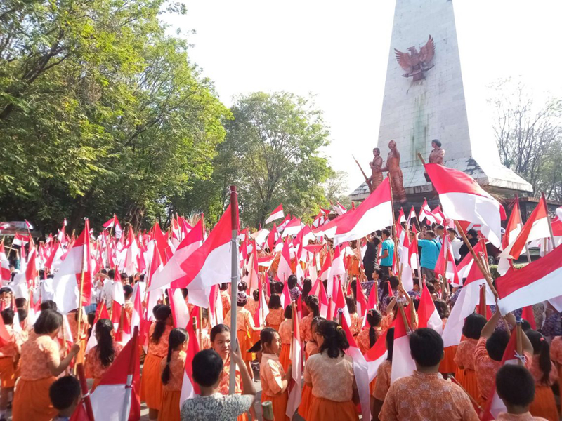 800 bendera nasional dalam upacara memperingati HUT RI ke-74 di Patung Monumen Banjarsri, Jawa Tengah.